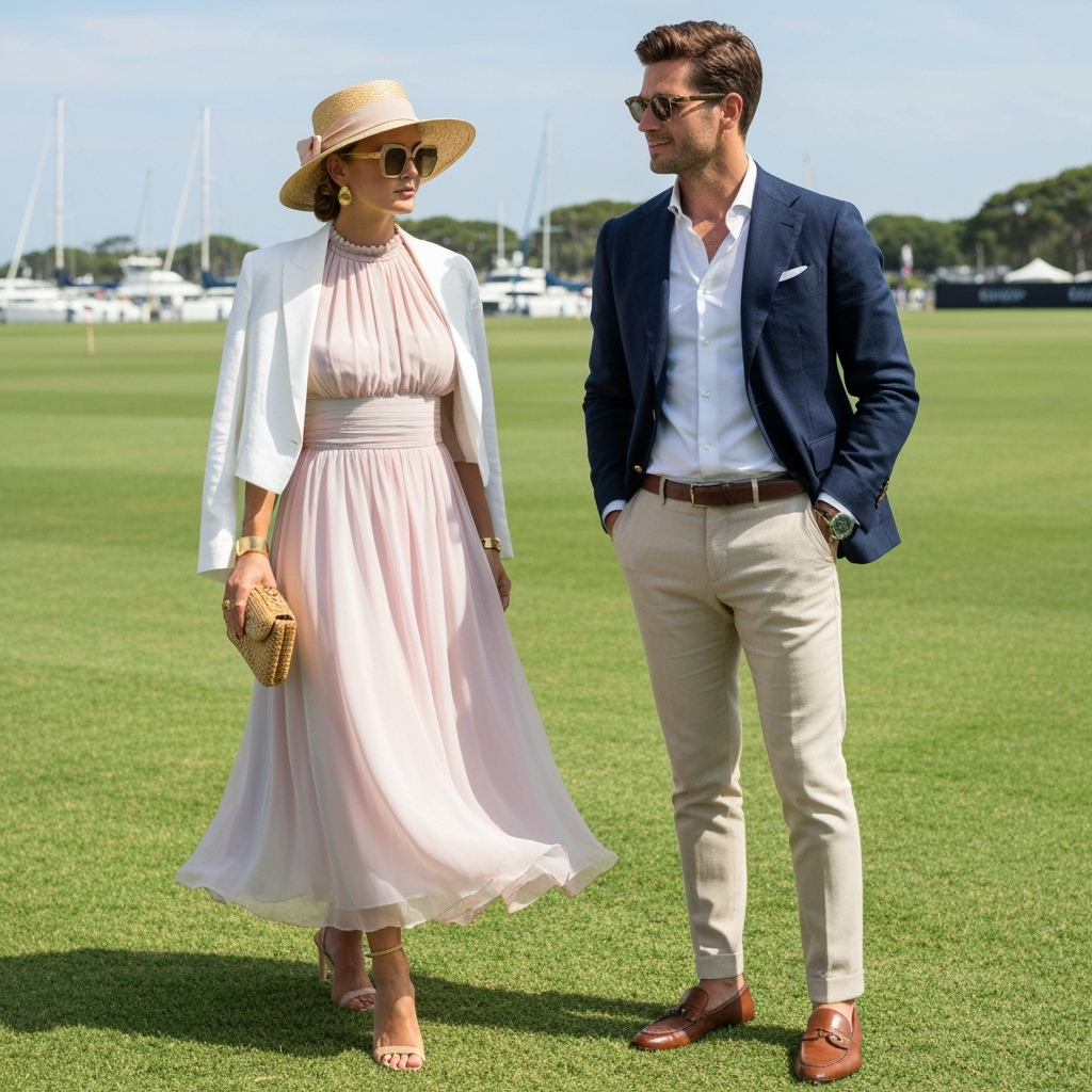 For ladies: flowing dresses, light tailoring, and accessories, including hats or fascinators, are encouraged, always mindful of the event’s open-air, marina-side setting.